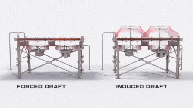 - ایرکولر افقی: در این نوع کولر هوایی، فنها در زیر یا بالای باندل نصب میشوند؛ مناسب برای نصب روی سازههای فلزی و فضاهای محدود. بسته به محل قرار گیری فن (بالا یا پایین باندل) خود به دو نوع Forced Draft و Induced Draft تقسیم میشوند.