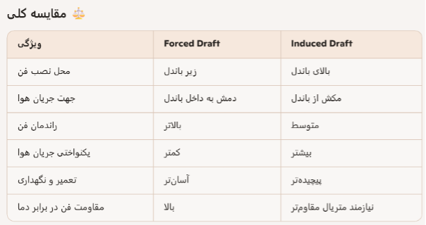- انتخاب فن: با توجه به نوع جریان هوا (Forced یا Induced) و شرایط محیطی.